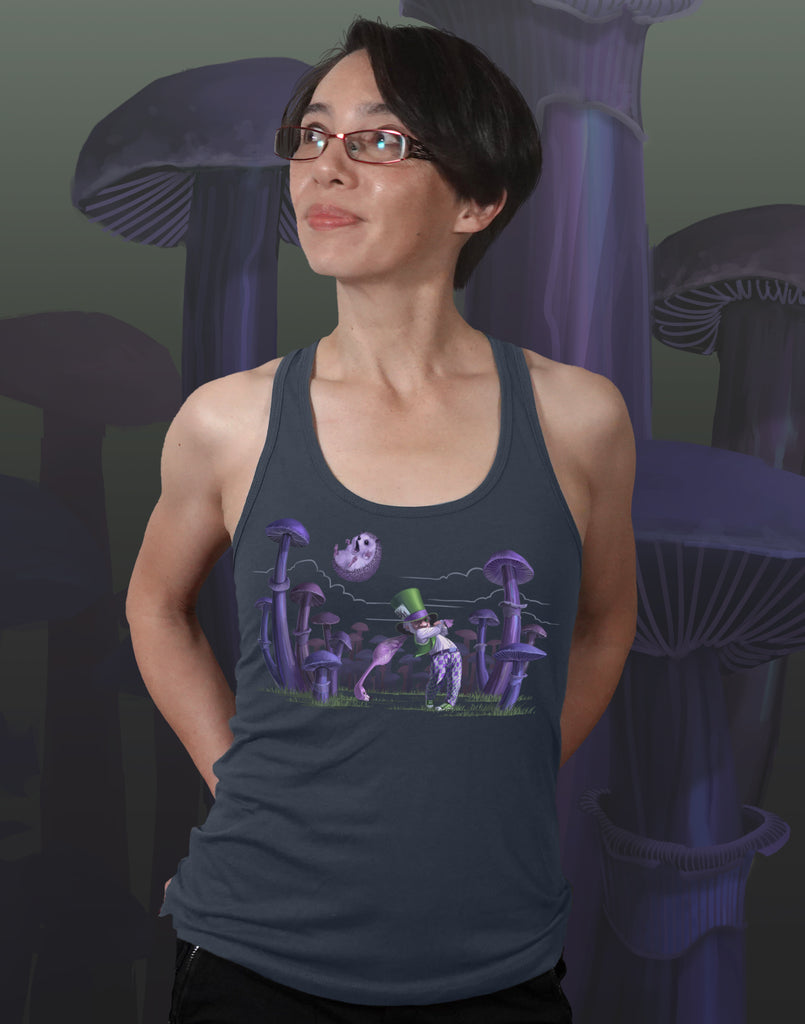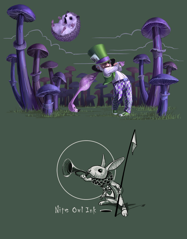 Front Design: In our Wonderland-inspired scene, while the Queen plays croquet with Alice, the Mad Hatter has snuck off to golf in the mushroom forest. There’s nothing like a clean, satisfying swing with his favorite pink flamingo to send a hedgehog soaring!
