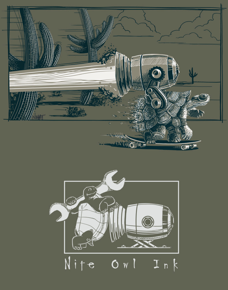 Back design: The mechanic proudly holds a wrench, showing off the latest invention: a jet-powered rocket he's about to strap to his shell. "Nite Owl Ink" printed below.
